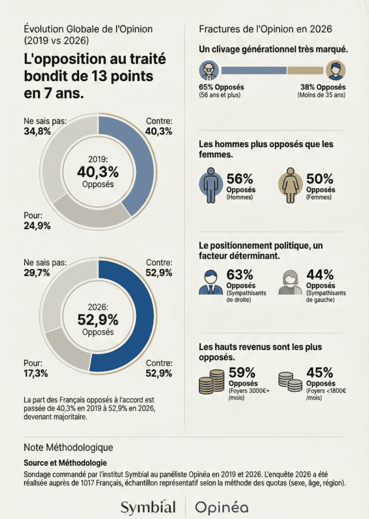 Le changement le plus spectaculaire dans l’opinion publique entre 2019 et 2026 est sans conteste le durcissement de l’opposition au traité. Là où le doute prédominait, une position majoritaire et tranchée s’est désormais installée.